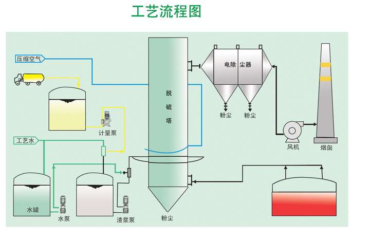 熱煙氣進(jìn)入噴霧感受吸收塔后立即與被霧化的堿性脫硫漿液接觸Ca(OH2),煙氣中的酸性成分(HCI/HF/SO2/SO3)被堿性霧滴吸收的同時(shí)水份被蒸發(fā),變成堿性顆粒,煙氣分配的精確控制,脫硫漿液流量和霧滴尺寸的控制確保了霧滴被轉(zhuǎn)化成細(xì)小的粉體。一些飛灰和脫離渣從吸收塔底部排出。已經(jīng)處理的煙氣進(jìn)入后續(xù)除塵器被去除剩余的懸浮顆粒。凈化后的煙氣通過(guò)煙囪排放。與此同時(shí),吸收塔和除塵器底部排出的干燥粉體顆粒被傳送到料倉(cāng)。